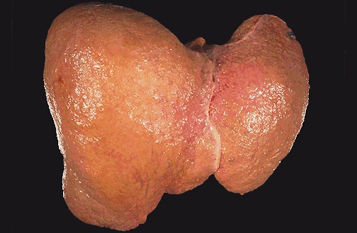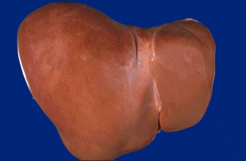 | Gross appearance of a normal liver. Note the smooth surface and the normal color of the liver. |