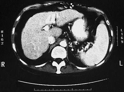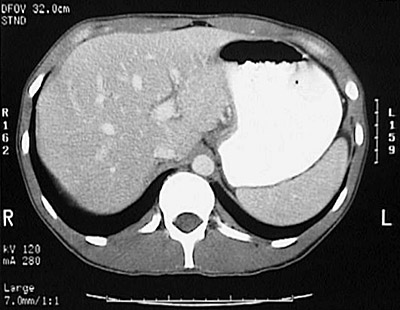 | CT scan of a cirrhotic liver. Again, the difference in the tissues is noticeable. |