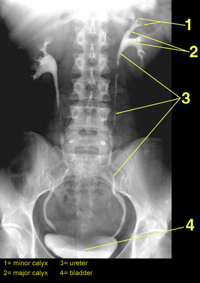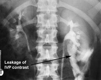 The image on the left is a normal IVP. The image on the right shows an IVP with contrast leak.