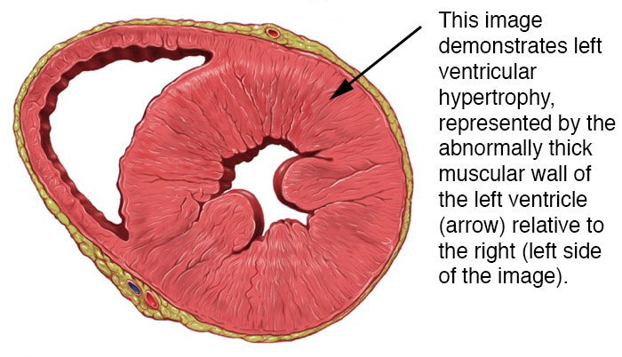 - Hypertrophic - Just as our skeletal muscles hypertrophy (grow in size) in response to increased demand, cardiac muscle undergoes hypertrophy when placed under a high workload for a prolonged period of time. Some cardiac hypertrophy is normal and reversible, such as that seen in athletes and pregnant women. Pathologic hypertrophy is the result of diseases that place increased demand on the heart, such as chronic hypertension, myocardial infarction, and valvular damage. Left ventricular hypertrophy (LVH) is the most common type of hypertrophic heart disease. A common cause of LVH is chronic hypertension, which increases the afterload on the left ventricle. This means the left ventricle has to increase contractility and/ or preload to maintain the same stroke volume. Over time the added stress on the left ventricular myocardium results in muscle hypertrophy and remodeling of the left ventricle to a less efficient size and shape. This leads to a diminishing ejection fraction, meaning the heart must work even harder to maintain cardiac output. The larger heart also demands more blood flow, and so becomes more susceptible to ischemic injury.