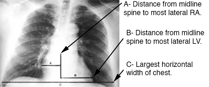 Cardiomegaly is often detected on an anterior-posterior chest x-ray (AP CXR). The standard method for measuring heart size on AP CXR is known as the Danzer Method, and it involves measuring the distance from the midline of the spine to the most lateral aspect of the cardiac apex (distance B, in the image below), and adding this distance to that found from the same midline to the most lateral aspect of the right atrium (distance A). This number is then divided by the largest horizontal width of the chest (distance C), from right to left pleural surface (usually found just above the left hemidiaphragmatic surface). This value (A+B/C) is known as the cardiothoracic ratio (CTR). A CTR > 0.5 indicates cardiomegaly.