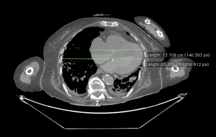 Cardiomegaly can also be diagnosed on CT scan. The screenshot below was taken from the postmortem CT scan of cadaver 33522. Using the medical imaging program Osirix, we measured this patient's CTR and found a heart width of 13.7 cm and a chest width of 20.2 cm, giving us a CTR of 13.7/20.2= 0.68 (this patient's largest horizontal chest width was actually below this cross section, but the difference in width was minimal and so we put both measurements on the same cross-section). Because a CTR less than 0.5 is considered normal, our CT scan indicates that this patient's heart is enlarged.