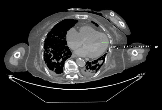 Another measurement was taken of the left ventricular wall thickness, which is normally between 0.6-1.1 cm. As you can in the screenshot below, we measured cadaver 33522's left ventricuar wall thickness to be 1.82 cm, indicating that left ventricular hypertrophy is a component of this patient's cardiomegaly.