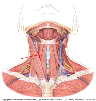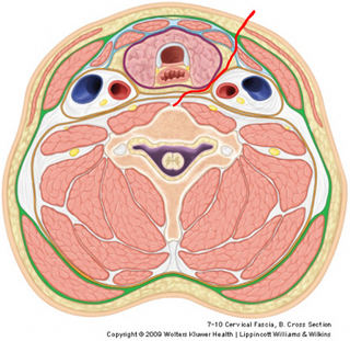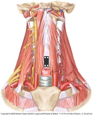 Since all surgery involves damage to the body, the plan is to get to the anterior surface of the vertebral bodies while doing the least damage to nerves, vessels, and visceral structures. As you can see on the image, a route medial to the sternocleidomastoid muscle and the carotid sheath, but lateral to the neck viscera will avoid major damage. Obviously, the strap muscles and especially their innervation from ansa cervicalis may take a severe beating.