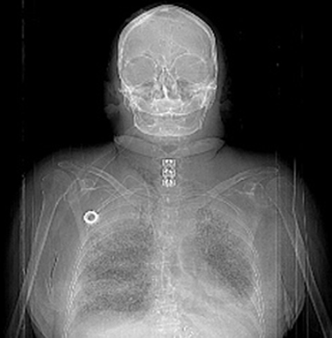 Above is the scout film (plain PA radiograph taken to indicate which sections are taken on a CT scan) of the person on Table 3-5. Note the metal plate in the lower neck. Also note the chemo infusion port or VAD (vascular access device) on the right chest wall, threaded down into the right atrium. A VAD is often used for chemotherapy.