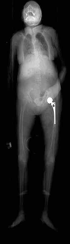 The image below is the scout film of cadaver 33487. Notice that the left hip joint has been replaced with a prosthetic joint consisting of a femoral stem attached to a ball that sits inside a prosthetic cup.
