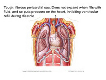 The pericardial sac is a tough, fibrous structure that normally holds about 25-50 cc of fluid around the heart. As fluid begins building up to an abnormally high level in the pericardial sac, the sac resists stretching and so puts pressure in the heart. After 150-250 cc of fluid has accumulated, a condition known as cardiac tamponade occurs. Cardiac tamponade is an emergency medical condition in which the fluid build-up in the pericardial sac exerts enough pressure on the heart to prevent refilling of the ventricles during diastole. This results in low stroke volume, low cardiac output, and eventually shock as the body enters a hypoperfusional state. Symptoms of cardiac tamponade are similar to those seen in shock. Classic cardiac tamponade presents 3 signs known as Beck's triad: