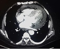 The image below is called a CTA (CT Angiography) scan, and is created by taking a CT scan of someone after a contrast dye has been injected into their circulatory system. Notice in this scan how blood containing the contrast appears as radiopaque as bone. As you can see, the heart in this patient is surrounded by a halo of fluid. The black space seen between the heart and the effusion is pericardial fat lying on the surface of the heart.