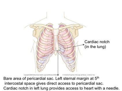 Caring for someone with a pericardial effusion that is causing cardiac tamponade requires the support resources of a hospital. The patient's shock is managed until a procedure can be performed to remove the fluid from around the heart (i.e. giving oxygen to the patient and vasopressors to combat the systemic vasodilation and subsequent hypotension that is characteristic of shock). Removal of the fluid in the pericardial sac is done by pericardiocentesis. This procedure involves inserting a needle, usually under ultrasound guidance, into the pericardial sac and aspirating fluid from the sac. As you can see in the image below, the best place to insert the needle for a pericardiocentesis is along the left sternal border in the 5th intercostal space. The cardiac notch of the left lung creates a bare area of the pericardial sac at this point, giving direct access to the heart. Not only is the pericardial sac unobstructed by the lung at this point, but it is also near the apex of the heart, where fluid is most likely to accumulate.