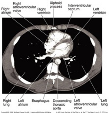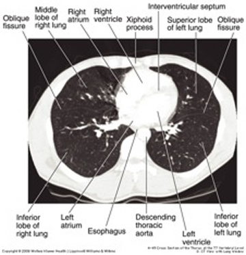 The image below on the left is a CT scan of a healthy chest at the T7 vertebral level. Notice how the lung spaces are clear all the way around the inner chest wall. The image to the right is the same CT scan viewed through the lung window. Notice on this image how healthy lung tissue is visible throughout the lung, with no fluid consolidations present.