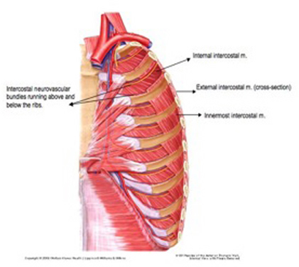 - Chest tube (Thoracostomy): An ostomy is defined as a surgically introduced hole in the body. A thoracostomy is, therefore, a surgically introduced hole in the thorax. A plastic chest tube is inserted into the hole, which then can be used as a drain for fluid and air that has entered the pleural space. Under local anesthetic and using a surgical sterile field, an incision is made in the chest wall at the level where the chest tube will be inserted. This incision should be made as central in the intercostal space as possible to avoid damaging the intercostal vessels and nerves that run along the superior and inferior borders of the ribs. A plastic chest tube is then inserted through this incision, past the skin and muscles of the chest wall (from superficial to deep in the axillary region: external intercostal mm., internal intercostal mm., innermost intercostal mm.). The image below to the left shows the pertinent anatomy of the chest wall, and the image on the right shows a typical chest tube set-up, with collection vesicle below the chest so that fluid drains out of the pleural space and not back into it (though one-way valves in the tubing also act to ensure no back flow into the pleural space).