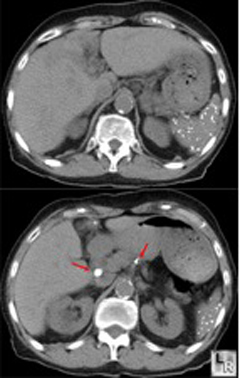 two calcified mesenteric lymph nodes (shown by red arrows).