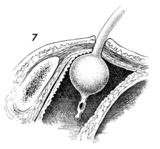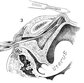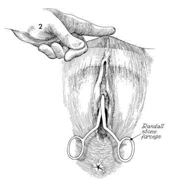 Upward pressure is maintained on the forceps while the tip of the forceps is palpated with a finger. Once the forceps have been palpated, a small suprapubic incision is made through the abdominal wall and overlying fascia until the forceps can be felt on the scalpel blade.