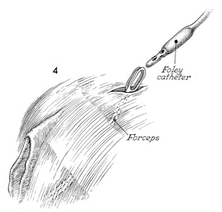 The forceps are forcefully pushed upward through the incision, where they can be used to grasp the tip of a Foley catheter.