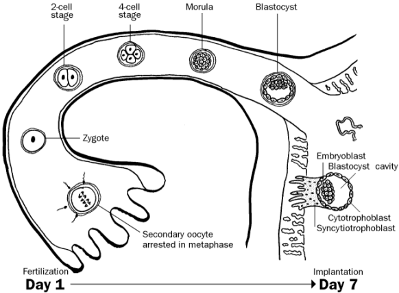 Fusion of PronucleiDNA in the male pronucleus is packed very tightly with protamines to make it compact enough to fit inside a sperm. These protamines are replaced by histones inside the egg, unpacking the DNA. Afterwards the male and female pronuclei fuse and the egg completes its second meiotic division, resulting in a second polar body. The fertilized egg is now known as the zygote (“together”). CleavageThe zygote undergoes a number of ordinary mitotic divisions that increase the number of cells in the zygote but not its overall size. Each cycle of division takes about 24 hours. The individual cells are known as blastomeres. At the 32-cell stage the embryo is known as a morula (L. “mulberry”), a solid ball consisting of an inner cell mass and an outer cell mass. The inner cell mass will eventually become the embryo and fetus, while the outer cell mass will eventually become part of the placenta. Blastocyst FormationCompactionThe cells on the outside of the morula form tight intercellular junctions and express ion channels to create an impermeable barrier. CavitationA fluid-filled cavity forms inside the morula. This cavity is known as the blastocyst cavity or blastocoele, and the morula is now called a blastula or blastocyst. The inner cell mass is now known as the embryoblast and the outer cell mass becomes the trophoblast. ImplantationHatchingThe blastula sheds its zona pellucida. This is required for implantation to occur. One function of the zona pellucida is to prevent premature implantation. Attachment and InvasionThe embryo attaches to and invades into the maternal