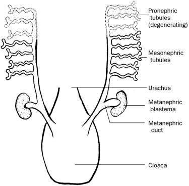 OverviewThe urogenital system arises during the fourth week of development from urogenital ridges in the intermediate mesoderm on each side of the primitive aorta. The nephrogenic ridge is the part of the urogenital ridge that forms the urinary system. Three sets of kidneys develop sequentially in the embryo: The pronephros is rudimentary and nonfunctional, and regresses completely. The mesonephros is functional for only a short period of time, and remains as the mesonephric (Wolffian) duct. The metanephros remains as the permanent adult kidney. It develops from the uteric bud, an outgrowth of the mesonephric duct, and the metanephric mesoderm, derived from the caudal part of the nephrogenic ridge. Urine excreted into the amniotic cavity by the fetus forms a major component of the amniotic fluid. Urine formation begins towards the end of the first trimester (weeks 11 to 12) and continues throughout fetal life. The kidneys develop in the pelvis and ascend during development to their adult anatomical location at T12-L3. This normally happens by the ninth week. Table 12 - Adult Derivatives of Embryonic Kidney Structures