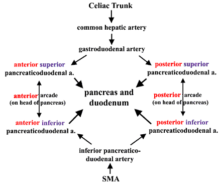 3. Trace the potential collateral blood flow between celiac and superior mesenteric arterial territories, and between superior and inferior mesenteric arterial territories. (W&B 463-465, 487, N301,N302,N304,N305,N306,TG5-13,TG5-14,TG5-27B,TG5-27C)Both the duodenum and the pancreas receive blood from the celiac trunk and the superior mesenteric artery. They serve as a site for anastomosis between these two large systems. The body and tail of the pancreas are supplied mostly by branches of the splenic artery, namely the great, superior, caudal, and dorsal pancreatic arteries.