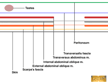 Layer of anterolateral abdominal wall Spermatic cord/testes covering skin scrotum superficial fascia scrotum/ dartos fascia&muscle external abdominal oblique aponeurosis external spermatic fascia internal abdominal oblique muscle cremaster muscle fascia from internal abdominal oblique muscle cremasteric fascia transversalis fascia internal spermatic fascia peritoneum processus vaginalis (obliterated)/ tunica vaginalis As for the development of the region with respect to the descent of the gonads, the descriptions in both Woodburne&Burkel and Moore can be a bit confusing. Here is the basic gist (see also #5 below):