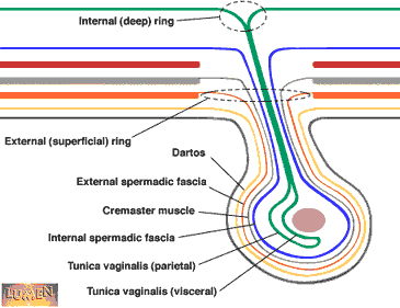 5. Review the descent of the gonads. (N 369A, 369B, 369C, 369D, animations)Briefly, the testes start out behind the peritoneum below the kidney, in the lumbar region. From there, they descend through extraperitoneal connective tissue, through the inguinal canal, and into the scrotum behind an extension of the peritoneal cavity called the processus vaginalis. The gubernaculum (fibrous tissue band) helps to pull the testes down into the scrotum through the inguinal canal. In adult life, the gubernaculum will become the scrotal ligament. The female case is similar, but the uterus develops within the pelvis and the gubernaculum fuses to its side, interrupting the descent of the ovary just below the pelvic brim. The gubernaculum ends up as a ligament from ovary to uterus (proper ovarian ligament) and a ligament called the round ligament of the uterus which passes from the uterus through the deep inguinal ring, the inguinal canal, and the superficial inguinal ring to the labia majora. Keep in mind that the descent of the testis involves an evagination of the abdominal wall and that this is where the inguinal canal starts (deep ring), this is also how the spermatic cord gets its layers from the layers of the abdominal wall. The peritoneum initially evaginates through the abdominal wall parallel to the round ligament (female) or spermatic cord (male) before birth. This normally closes but if it remains open it constitutes a congenital inguinal hernia.6. What does the small genital branch of the genitofemoral nerve innervate?The small genital branch of the genitofemoral nerve innervates the cremaster muscle. It also anastomoses with the anterior scrotal/labial nerve (from the ilioinguinal nerve) to supply the skin of the area.7. Does the weak fascia between the falx inguinalis and inguinal ligament have a thickened lateral border (an interfoveolar ligament)?This depends on your cadaver. Netter 251 or TG 5-08, 5-09 shows it from the internal view.8. What tissue forms the deep (internal) inguinal ring, and how does it do so?The deep inguinal ring is formed by transversalis fascia above the midpoint of the inguinal ligament. It is not really "ring"-like, but is more of a sleeve.9. What passes through the deep ring? (N 252, 354, TG 5-08, 5-09)In the male, the structures that make up the spermatic cord traverse the ring (actually, the cord is formed at the ring). In the female, it is the round ligament of the uterus.10. What are the relationships of the medial inguinal fossa and lateral inguinal fossa to the weak fascia and the deep inguinal ring? (N 245, TG 5-07, 5-08, 5-09)Direct inguinal hernias start in the inguinal triangle, which is at the base of the medial inguinal fossa, between the medial and lateral umbilical folds. This triangle, since it is covered by weak fascia, allows direct hernias to pierce the anterior abdominal wall. Indirect inguinal hernias start at the base of the lateral inguinal fossa, lateral to the lateral umbilical fold. The deep inguinal ring, which transmits indirect hernias, is just lateral to the inferior epigastric vessels at the base of this fold.11. Define the inguinal triangle. (N 251, TG 5-07)This is the weak area defined by the lateral border of rectus abdominis muscle, the inferior epigastric artery, and the inguinal ligament.12. What is the relationship between direct and indirect inguinal hernias and the falx inguinalis, weak fascia, deep and superficial inguinal rings, inguinal canal, and inguinal ligament? (N 251, TG 5-07, 5-08, 5-09, 5-11A, 5-11B, 5-11C)OK... here we go AGAIN! (Are you getting the impression that this is something you should know?) Direct inguinal hernias pass through the inguinal triangle (see #2, #10, and #11), which is an area of weak fascia. They almost never go into the scrotum. Both the superficial inguinal ring and the inherent weakness of abdominal wall lateral to the falx inguinalis make this area susceptible to hernias. Indirect inguinal hernias start at deep inguinal ring, pass down inguinal canal, through superficial ring, and, in the male, usually descend into scrotum along with the spermatic cord. In the female they travel along the round ligament.13. Define the inguinal canal, noting location, orientation, rings, walls, shape, and relationships.See #1 above.14. How are the coverings of the spermatic cord represented in the scrotum? (N 370, TG 5-10B, 6-31)From superficial to deep, the cord is covered by skin, tunica dartos muscle, external spermatic fascia, cremaster muscle, internal spermatic fascia. In the area of the testis, there is an additional deepest layer, the tunica vaginalis (anterior and lateral). The external spermatic fascia, cremaster muscle, and internal spermatic fascia are the coverings of the spermatic cord proper, i.e., they wrap around it.15. Compare the inguinal canal in male and female: (N 253, 360, TG 5-08A, 5-08B, 5-08C, 5-08D, 5-09A, 5-09B, 5-09C, 5-09D)The inguinal canal is essentially the same in both sexes (see questions above). The character of the layers is diminished in the female and, of course, the contents are different.16. To what does the round ligament of the uterus attach? (N 360, 354, TG 5-09A, 5-07)The round ligament, derived from the gubernaculum, is attached to the uterus on the lateral surface below the uterine tube. From there, it runs through the inguinal canal to end in the labia majora.17. What is its male homologue? (N 369C, 369D)The scrotal ligament is the male remnant of the gubernaculum. It, however, does not run through the inguinal canal, since it pulled the testes through.18. What is the scrotal ligament? (N 369)The remains of the embryonic gubernaculum, the fibrous tissue which helps to pull the testes into the scrotal cavity. It attaches the inferior end of the testis to the inner aspect of the scrotal sac.