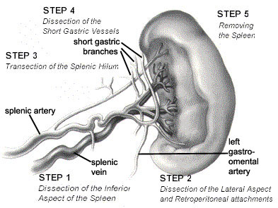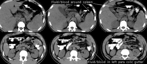 A twenty-six year old female presents to your Emergency Room after a motor vehicle accident. The patient reports that she was a pedestrian on South University Avenue and while crossing the street was struck by a car. The patient's only complaints are abdominal tenderness and left shoulder pain. On physical exam you note that her vital signs are: blood pressure (BP) 90/60, heart rate (HR) 110, and respiratory rate (RR) 12. Her abdomen is tender on palpation of the left upper quadrant, with a faint tire mark over that area; in addition you detect crepitus (indicating fractured ribs) over the 9th,10th, and 11th ribs on the left side. You order a CBC which demonstrates an increased white blood count and a decreased hematocrit. You perform a diagnostic peritoneal lavage (DPL) and order a CT. The DPL has a bloody drainage (through which you cannot read a newspaper) and CT confirms a complete splenic rupture and fractured ribs. The patient is taken to the O.R. for a splenectomy