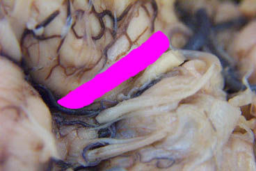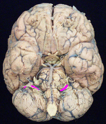 The facial nerve is primarily a motor nerve, but also carries special sensory (taste) fibers. CN VII emerges between the pons and medulla on the brain and exits the skull through the internal acoustic meatus, facial canal and finally the STYLOMASTOID FORAMEN. Branches of the facial nerve supply the MUSCLES OF FACIAL EXPRESSION, taste to the anterior two thirds of the tongue (chorda tympani), parasympathetic innervation to the submandibular and sublingual glands (chorda tympani), and the lacrimal glands and mucous glands of the soft palate, nose, and paranasal sinuses (greater petrosal nerve).