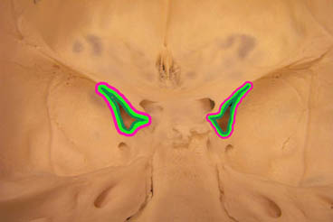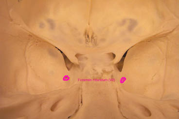 FUNCTIONS: will be discussed for each division of CN V. The trigeminal nerve supplies both sensory and motor innervation to various parts of the head and neck. The first two divisions are purely sensory and will be discussed first. OPHTHALMIC division (CN V1) is a sensory nerve that passes through the SUPERIOR ORBITAL FISSURE and supplies the eyeball, conjunctiva, lacrimal gland and sac, nasal mucosa, frontal sinus, external nose, upper eyelid, forehead and scalp. MAXILLARY division (CN V2) is a sensory nerve that passes through the FORAMEN ROTUNDUM. It relays sensation from the skin of the face over the maxilla including the upper lip, maxillary teeth, nasal mucosa, maxillary sinuses and palate. |