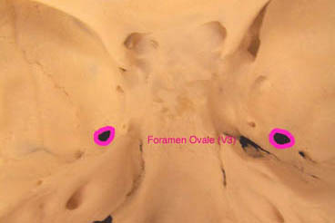 MANDIBULAR division (CN V3) passes through the FORAMEN OVALE that is both a sensory and motor nerve. The motor component supplies the MUSCLES OF MASTICATION, mylohyoid, anterior belly of the digastric, tensor veli palatini and tensor tympani. Sensation from the skin over the mandible, including the lower lip and side of the head, mandibular teeth, mucosa of the mouth and the anterior two thirds of the tongue is also relayed by CN V3.