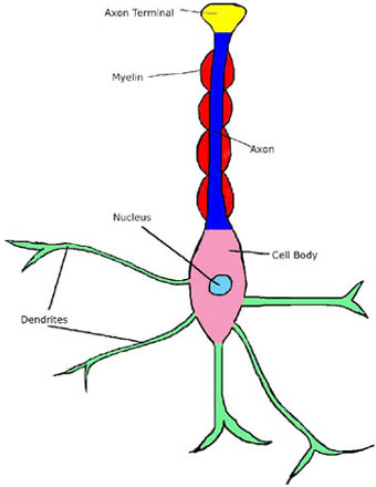 Before discussing the details of the nervous system, it is helpful to have a basic understanding of the cellular building blocks of the nervous system. The business cell in the nervous system is the neuron. In addition to neurons, there are also numerous support cells that will be covered in detail in other courses. Here, we will focus on neurons. A neuron's job is basically to pass messages from one part of the body to another. There are several types of neurons based on their structure and function, but all have certain common characteristics. First, they have a cell body with nucleus and organelles to provide for general metabolism and cellular maintenance. Second, they have processes specialized to receive(dendrites) and transmit (axons) signals. They have one to many dendrites, some of which have special endings that receive specific types of stimuli, such as pressure or temperature. Other dendrites may receive signals from other neurons. Neurons have only one axon process, which has one to several terminal endings that release neurotransmitters. Only the axon is capable of transmitting a signal to another neuron or to a cell of an effector organ through its neurotransmitter. In the nervous system axon terminals usually end on other neurons, most commonly on the dendrites of another neuron, but also on the cell body and rarely on an axon. The contact point between the neurons is called a synapse. A neuron's axon may be very long, such as an axon that runs all the way from the spinal cord to the big toe, or it may be very short, staying within a spinal cord segment. Signals that travel along axons are essentially electrical and consequently processes and neurons have to be insulated from one another like electrical wires. This is accomplished by supporting cells that encapsulate the neurons (except at synapses and axon terminals) or form sheaths around the processes. The sheath cells around some processes produce a lipid and protein material that is whitish in appearance called myelin. The myelin insulates the processes and greatly increases the speed of signal transmission. Neurons or processes that have myelin sheaths are said to be myelinated. Some neurons have processes that have a cellular sheath but lack myelin and they are said to be unmyelinated. The vast majority of axons in the nervous system are myelinated and accumulations of them appear whitish. Cell bodies never have myelin and accumulations of them have a grayish appearance. The nervous system is composed of billions of neurons that make billions of connections. This complexity gives us the ability to do everything from walk, to feel emotion, to learn, to constrict blood vessels, make us breathe and all of the other things that make us human.