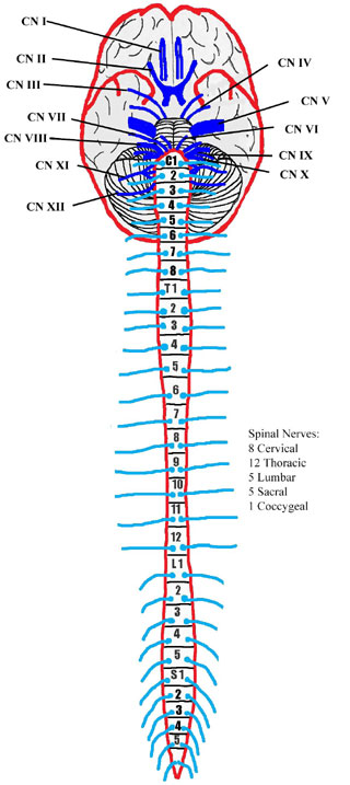 We will first discuss the structural divisions of the nervous system: the central nervous system and the peripheral nervous system. These divisions are often abbreviated CNS and PNS, respectively. The central nervous system consists of the brain and the spinal cord, while the peripheral nervous system consists of the nerves outside the central nervous system. A couple of useful terms to define at this point are nucleus and ganglion. In the central nervous system, a collection of neuron cell bodies is called a nucleus. In the peripheral nervous system, a collection of neuron cell bodies is called a ganglion (plural: ganglia). The one exception to this rule that you may have encountered is the basal ganglia in the brain. Indeed, the basal ganglia technically should be called the basal nuclei, but they were named prior to the terms being defined and the name has stuck. Remembering the difference between a nucleus and a ganglion, and that both are simply collections of nerve cell bodies, will help you as we add more information onto the nervous system. In the image, the red structures depict the central nervous system, and the blue structures depict the peripheral nervous system. While these branches are called "nervous systems," they are not actually separate systems. The central and peripheral nervous systems differ structurally and are therefore considered separately, but they work together and are both part of the same overall system.
