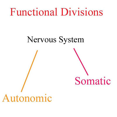 In addition to dividing the nervous system structurally, the nervous system can be divided functionally into the somatic nervous system and the autonomic nervous system. Again, remember that these are not actually separate nervous systems, just different components of one system. |