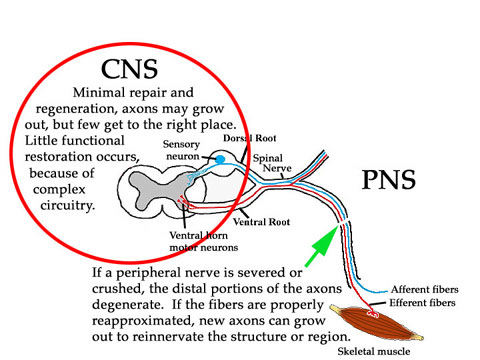 In this course we pose many nerve lesion or injury questions in order to test understanding of nerve innervation and pathways. Injuries to the nervous system are common and may occur through disease processes or trauma (crushing or cutting). The effect of the power of the body to repair or compensate for the disease or injury depends upon the site and nature of the injury. Injuries or diseases may destroy neurons or interrupt nerves leading to an identifiable loss of function affecting sensory, motor or integrative functions. Little or no regeneration or repair occurs in the central nervous system, although there may be compensation for some injuries. When a neuron dies it is not replaced. When injured, particularly when cut, peripheral nerves may regenerate by the growing of new axons down the remaining nerve sheath. Regrowth occurs at about 1 mm/day and the amount of functional restoration depends upon how well the cut nerves are reapproximated.
