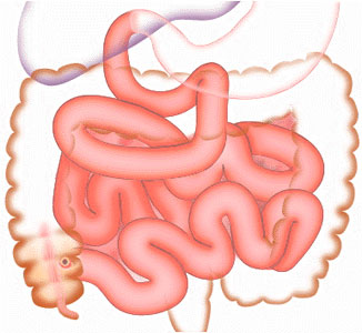 The small intestine comprises the duodenum, jejunum, and ileum. The duodenum, the first and shortest part, empties into the jejunum at the duodenojejunal junction. The jejunum coils for approximately 8 feet before becoming (by gradual transition) the ileum. The ileum then coils for another 12 feet, approximately, before emptying into the large intestine. |