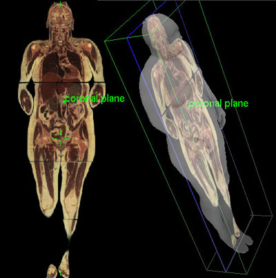 A coronal plane, also called a frontal plane, is any plane passing down through the body parallel to the coronal suture of the skull, dividing the body into front and back portions. Coronal planes are therefore perpendicular to sagittal planes and pass through the length of the body.