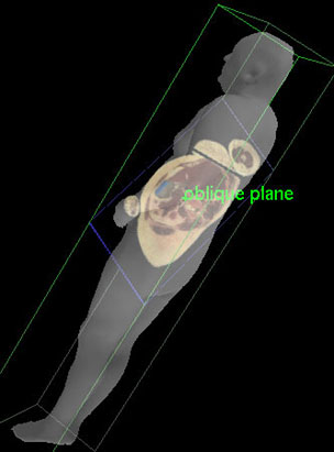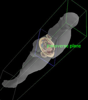 Transverse planes are perpendicular to both sagittal and coronal planes. They pass through the width of the body in a horizontal or transverse direction, similar to the slices of a loaf of bread. Transverse planes divide the body into upper and lower sections, and are also called horizontal or axial planes or cross-sections.