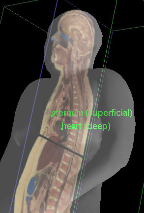 Superficial - Deep A superficial structure is closer to the body surface (skin) than a deeper structure. Example: The sternum (breast-bone) is superficial to the more deeply lying heart. |