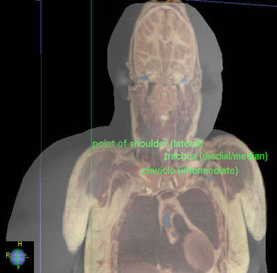 Example: The trachea is a median structure. It lies medial to the more laterally placed point or top of the shoulder. The clavicle is intermediate between these two. One could also say that the clavicle is medial to the point of the shoulder, but lateral to the trachea.