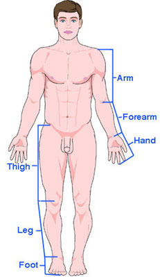 In addition to these relative terms, certain body regions are more rigorously defined anatomically. The upper limb, commonly referred to as the "arm", is more precisely defined as the arm extending from shoulder to elbow, the forearm from elbow to wrist, and the hand distal to the wrist. Similarly, the lower limb is made up of the thigh, from hip to knee, the leg which extends from knee to ankle, and the foot distal to the ankle.