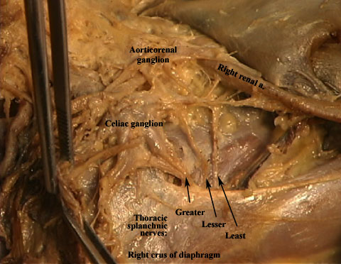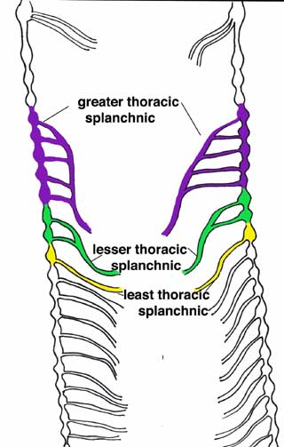 | Sympathetic splanchnic nerves are anteriorly directed branches from the sympathetic trunk. Greater thoracic splanchnic nerve arises via branches from sympathetic ganglia from T5-T9. Lesser thoracic splanchnic nerve arises via branches from T10 & T11. Least thoracic splanchnic nerve arises from T12. The thoracic splanchnic nerves pass through the crura of the diaphragm (attachments to the lumbar vertebrae).