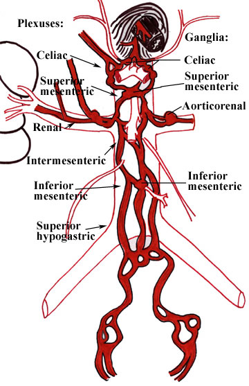 The named prevertebral or preaortic ganglia in the abdomen are the paired celiac, the superior mesenteric, paired aorticorenal, and the inferior mesenteric. These ganglia are all sympathetic, of course, since all parasympathetic fibers (below the head, that is) synapse in the wall of the target organ. |  |