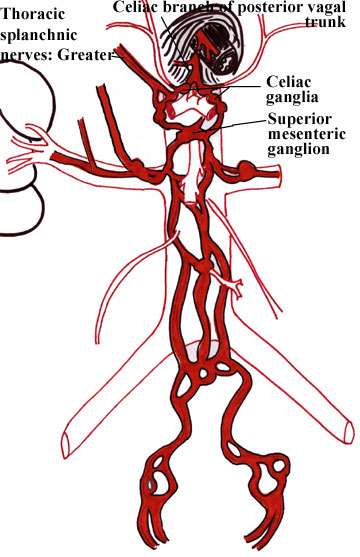 Parasympathetic fibers from the celiac branch of vagus also pass through these ganglia and the celiac and superior mesenteric plexi, to reach the organ wall to synapse. It is important to understand that these preaortic ganglia are sympathetic ganglia, so no parasympathetics would synapse there. Parasympathetic fibers synapse within the walls of the organ being innervated (with some exceptions in the head). |  |