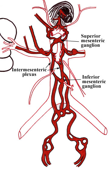 | The intermesenteric plexus lies along the abdominal aorta between the superior and inferior mesenteric arteries. It is primarily formed by the upper lumbar splanchnic nerves (L1 and L2), but also receives fibers from the aorticorenal and superior mesenteric ganglia. However, it is important to note that it does not contain any vagal parasympathetic fibers - vagal fibers do not descend, on the surface of the aorta, below the superior mesenteric and renal plexuses. That is why the hindgut, supplied with blood by the inferior mesenteric artery, is also supplied with parasympathetic nerves via the pelvic splanchnic nerves. |  |