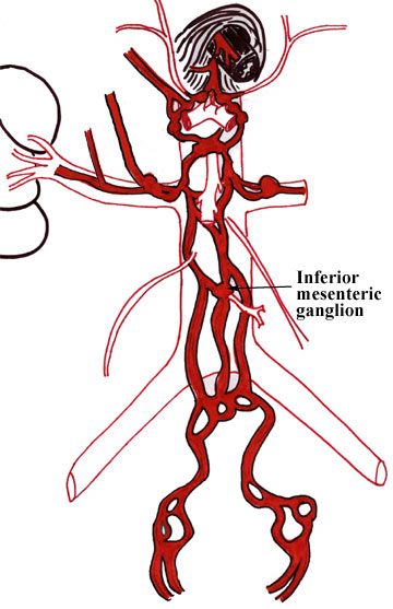 | The inferior mesenteric plexus extends along the inferior mesenteric artery. It contains sympathetic fibers only. An inferior mesenteric ganglion is not often seen, and instead preganglionic sympathetic fibers from the intermesenteric plexus synapse on diffuse ganglion cells near the origin of the inferior mesenteric artery, and postsynaptic fibers follow the artery and its branches. No parasympathetic fibers are found in this plexus. Parasympathetics from the pelvic splanchnic nerves innervate the colon from the splenic flexure to the anal canal. These fibers travel through the fusion fascia on the left side of the posterior abdominal wall to reach the colon walls, synapsing there. |  |