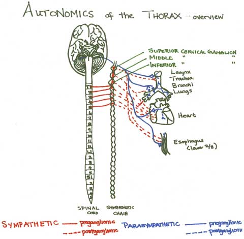 INTRODUCTION Many organs throughout the body receive dual innervation from the sympathetic and parasympathetic divisions of the autonomic nervous system. Within the thorax the organs of particular importance are the heart, lungs and esophagus. This lesson will describe how autonomic fibers reach their target organs and what responses can be expected upon stimulation by either sympathetic or parasympathetic fibers. |