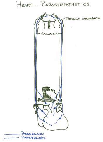 Unlike the sympathetic innervation, which must first synapse within chain ganglia to supply the heart with postsynaptic fibers, the parasympathetic fibers synapse at ganglia located directly on the heart and short postsynaptic fibers then supply the target organ. Parasympathetic stimulation acts to DECREASE its rate and contractility.