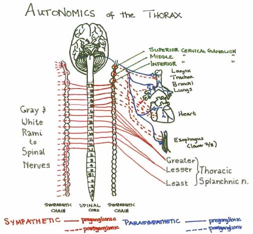 In summary, the autonomic innervation of thoracic viscera is derived from both parasympathetic and sympathetic systems. Autonomic fibers form the cardiac, pulmonary and esophageal plexuses.