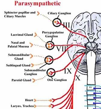 There are 4 pairs of parasympathetic ganglia in the head, with 4 stories to go with them. Although 4 cranial nerves have brainstem nuclei containing preganglionic parasympathetic neurons, only 3 of these nerves have branches that reach these 4 ganglia - the vagus nerve (X) never has any named, discrete ganglion associated with it, only diffuse ganglia in organ walls. The 4 ganglia and their associated cranial nerves are the: