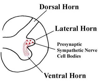 We will first spend some time discussing the sympathetic division of the autonomic nervous system. The sympathetic division is sometimes called the thoracolumbar outflow or division of the ANS because the cell bodies of the presynaptic sympathetic neurons are located in the lateral horns (a.k.a. intermediolateral cell columns) of the spinal cord gray matter, which are found in spinal cord segments T1 through L2. There are no sympathetic presynaptic cell bodies above spinal cord level T1 or below spinal cord level L2. The cell bodies of the postsynaptic sympathetic neurons are found in either paravertebral or prevertebral ganglia. The paravertebral ("beside the vertebrae") ganglia are called the sympathetic chain ganglia and will be discussed in more detail later. Prevertebral ganglia, also known as preaortic or collateral ganglia, are located around the major branches of the abdominal aorta and include the celiac, aorticorenal, superior mesenteric, and inferior mesenteric ganglia. The sympathetic nervous system innervates essentially all the organs of the body as well as blood vessels (smooth muscle in vessel walls), sweat glands, and arrector pili muscles through out the body. (Arrector pili muscles make the hairs on your body stand up, resulting in goose bumps.) |