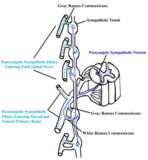 To reach these structures in the neck, body wall and limbs, postsynaptic fibers exit the sympathetic trunk via gray rami communicantes, then enter the spinal nerves to be passed to the ventral primary rami and dorsal primary rami for distribution to the periphery.