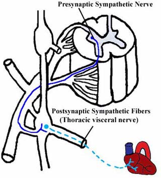 Within the thorax, the sympathetic nervous system innervates the heart, trachea, bronchi, lungs and esophagus. To reach these organs, the postsynaptic sympathetic fibers exit the sympathetic trunk as cervical cardiac branches and thoracic visceral nerves (the thoracic visceral nerves could not be called thoracic splanchnic nerves, because that name is used for another type of sympathetic visceral branch, which you will see soon). These nerves enter the cardiac, pulmonary, and esophageal plexuses to innervate their target organs. Sympathetic innervation to the heart increases heart rate and strength of contraction, as well as dilates the coronary vessels. Sympathetic innervation to the trachea and lungs leads to bronchodilation and reduced secretions, maximizing air exchange. Sympathetic innervation to the esophagus decreases peristalsis and limits the blood flow in order to preserve blood for the skeletal muscles.