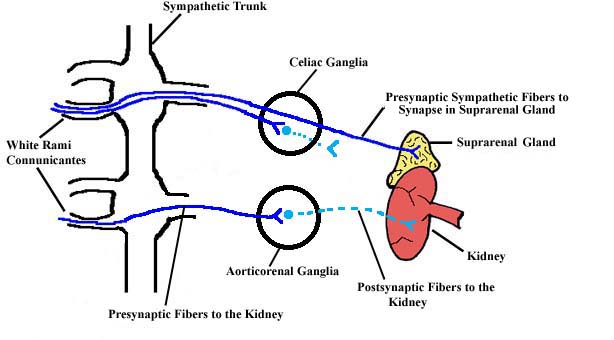 The suprarenal gland (also known as the adrenal gland) is unique in its innervation and function. The cells in the medulla of the suprarenal gland behave like a collection of postsynaptic sympathetic neurons in that they release epinephrine (and some norepinephrine) upon stimulation by a presynaptic sympathetic nerve. Presynaptic sympathetic fibers to the suprarenal medulla pass from the greater thoracic splanchnic nerves through the celiac ganglia without synapsing and terminate on the medullary cells. In response to the presynaptic signal, the suprarenal medullary cells release epinephrine (and norepinephrine) into the blood stream. In contrast to postsynaptic sympathetic neurons that release norepinephrine onto specific organs resulting in a change of function within that organ, the cells of the suprarenal medulla secrete epinephrine (85%) and norepinephrine (15%) into the blood stream producing a systemic, or whole-body, fight or flight response.